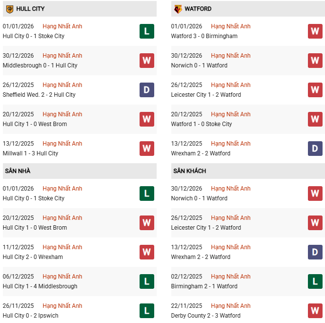 Trước trận thua Stoke, Hull từng trải qua chuỗi 5 trận ấn tượng với 4 chiến thắng và 1 trận hòa. Điểm tựa lớn nhất của Hull City nằm ở phong độ sân khách rất đáng nể, khi họ mang về 18 điểm sau 12 chuyến hành quân. Còn trên sân nhà MKM, Hull mới thắng 7/13 trận. Riêng 5 trận gần nhất, họ để thua tới 3 lần. Ở vòng đấu đầu tiên trong năm 2026, Hull bị Stoke City hạ gục với tỷ số 1-0.
