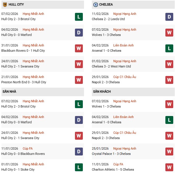 Thống kê phong độ Hull vs Chelsea:
