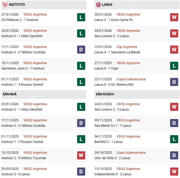 Thống kê phong độ Instituto vs CA Lanus: