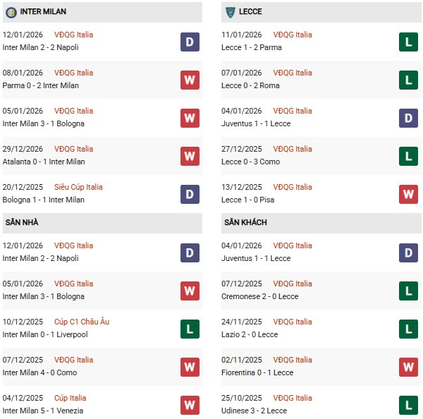 - 10 trận đối đầu gần nhất giữa 2 đội, Inter thắng 8, thua 1 trước Lecce.