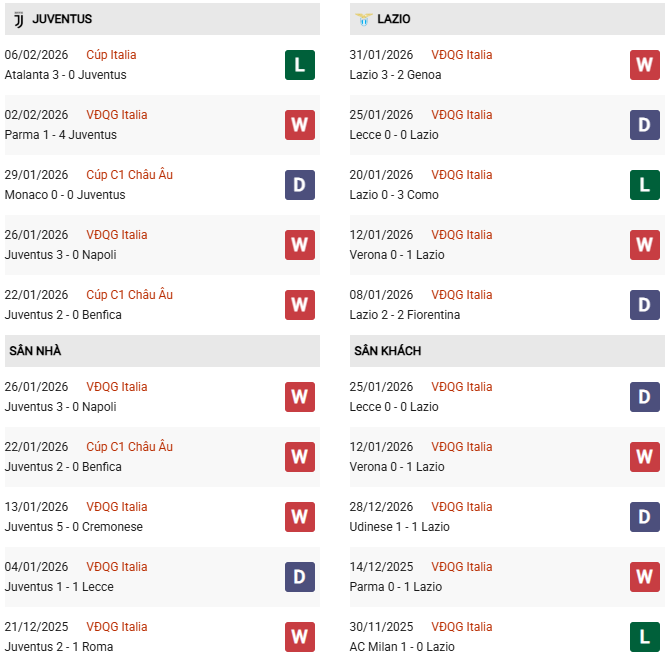 Thống kê phong độ Juventus vs Lazio: