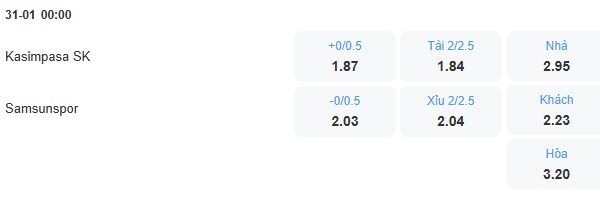 Hàng công của cả Kasimpasa và Samsunspor đều chơi không tốt ở chuỗi trận không thắng vừa qua, mỗi đội chỉ ghi 1 bàn ở 2 trận gần nhất. Đây là điều sẽ khiến trận đấu giữa 2 đội có ít bàn thắng được ghi. Với kèo tổng số bàn thắng là 2.25 thì nên chọn kèo Xỉu chung cuộc.