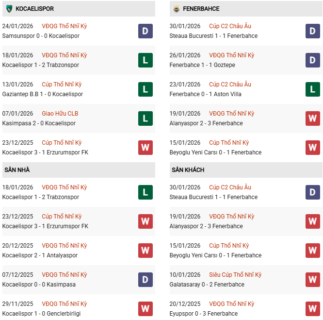 - 4 trận đối đầu gần nhất giữa 2 đội, Kocaelispor hòa 2, thua 2 trước Fenerbahce.