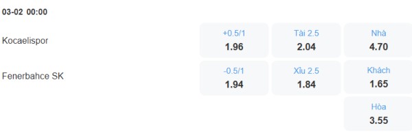 Kocaelispor chỉ ghi được 1 bàn trong 3 trận gần nhất của mình, trong khi đó hàng công Fenerbahce ghi 2 bàn trong cùng số trận. Các trận gần đây của 2 đội không trận nào có nhiều bàn thắng nên khả năng trận đấu sắp tới cũng vậy. Nên chọn kèo Xỉu thì cơ hội thắng cuộc cao hơn.