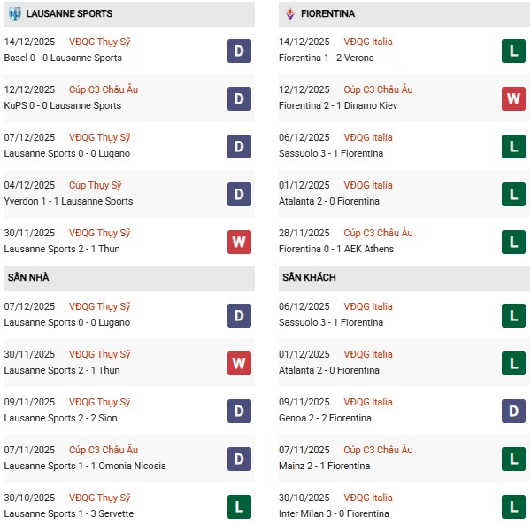 Thống kê đối đầu Lausanne vs Fiorentina: