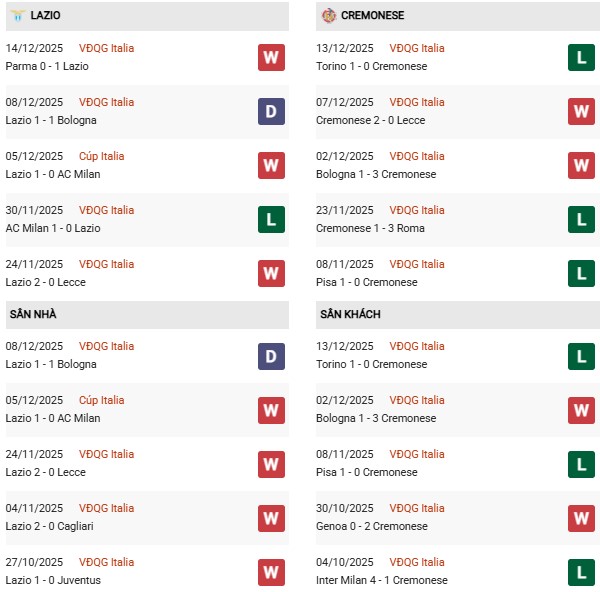 Sân nhà Olimpico tiếp tục là điểm tựa lớn khi Lazio thắng 5/8 trận mùa này, chỉ thua 1. Lịch sử đối đầu cũng ủng hộ họ: Lazio thắng 7 và hòa 1 trong 8 lần tiếp Cremonese gần nhất.