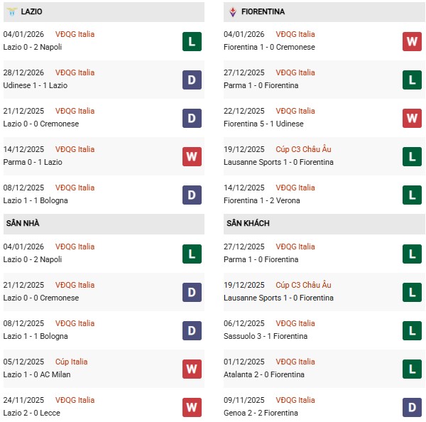 Thống kê phong độ Lazio vs Fiorentina: