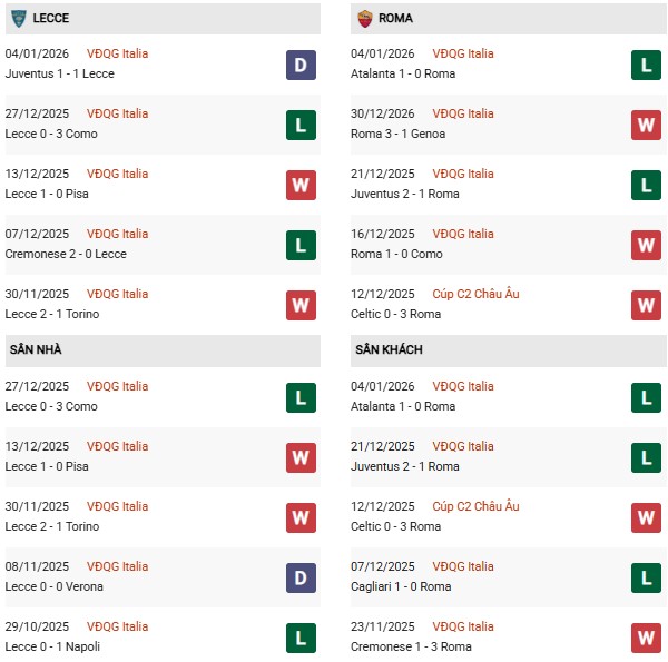Bên phía đối diện, AS Roma không có được những kết quả tích cực tại Serie A trong thời gian vừa qua. Cũng dễ hiểu 3/4 thất bại gần nhất mà thầy trò HLV Gasperini phải nhận khi họ chạm trán các đối thủ khó chịu là Napoli, Juventus và Atalanta. Chỉ phải làm khách trước Lecce ở vòng đấu này sẽ là cơ hội để Roma tìm kiếm chiến thắng nhằm tiếp tục cạnh tranh một vị trí cao trên BXH ở mùa giải năm nay.