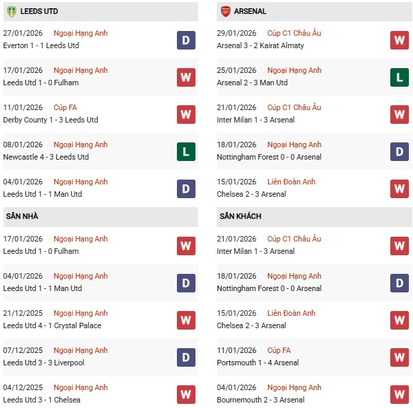 Số liệu thống kê về Leeds United gặp Arsenal: