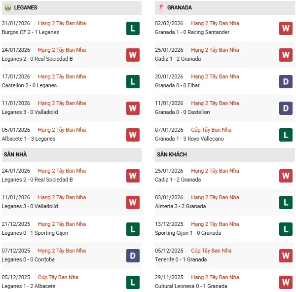 Ở chiều ngược lại, Granada đang xếp thứ 15, cũng có 29 điểm nhưng phong độ kém hơn rõ rệt. Đội khách chỉ thắng 1/5 trận gần nhất, hàng thủ để lọt lưới đều đặn, trong khi hàng công thiếu sự sắc bén khi gặp các đối thủ có tổ chức tốt. Việc phải làm khách càng khiến Granada gặp bất lợi lớn, nhất là khi họ thường chơi lép vế trước các đội kiểm soát bóng tốt như Leganés.