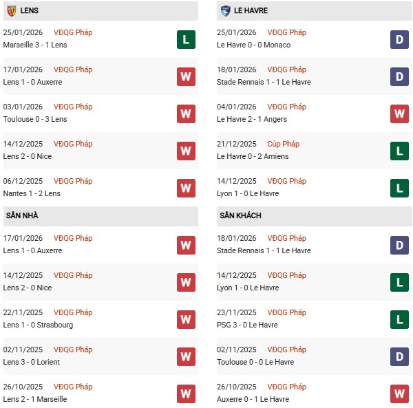 Thống kê phong độ Lens vs Le Havre: