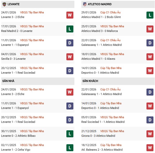Thống kê phong độ Levante vs Atletico Madrid: