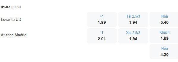 Có thể thấy Atletico Madrid là đội có chất lượng đội hình tốt hơn so với Levante. Đội khách cũng đang là đội có phong độ tốt hơn nên sẽ không có gì ngạc nhiên nếu phần thắng trận này thuộc về họ. Với tỉ lệ kèo Atletico Madrid chấp 1 trái thì nên đặt cửa cho đội khách thì cơ hội thắng cuộc cao hơn.