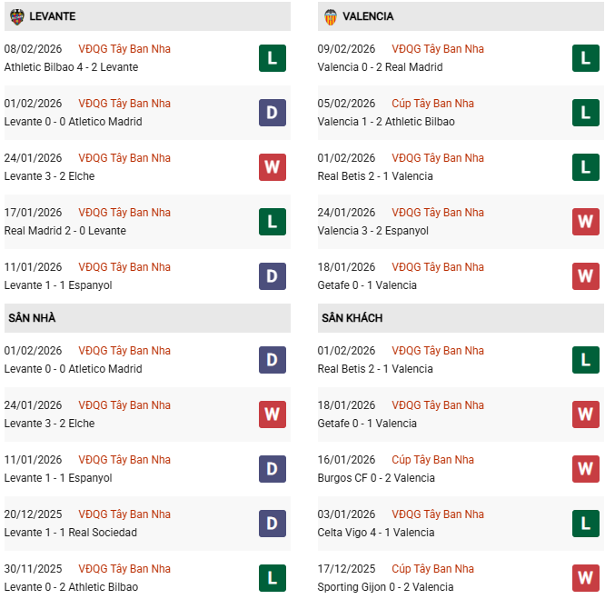 Levante (Hạng 19): Với 18 điểm, Levante đang đứng áp chót bảng xếp hạng. Tuy nhiên, phong độ sân nhà của họ gần đây khá ổn định (thắng 1-0 trước Valencia ở lượt đi tháng 11/2025). Lối chơi của Levante dựa nhiều vào tinh thần chiến đấu và sự cổ vũ cuồng nhiệt tại Ciudad de Valencia.