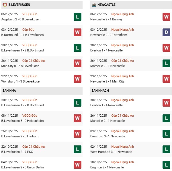 - 2 trận đối đầu gần nhất giữa 2 đội, Leverkusen toàn thua trước Newcastle.