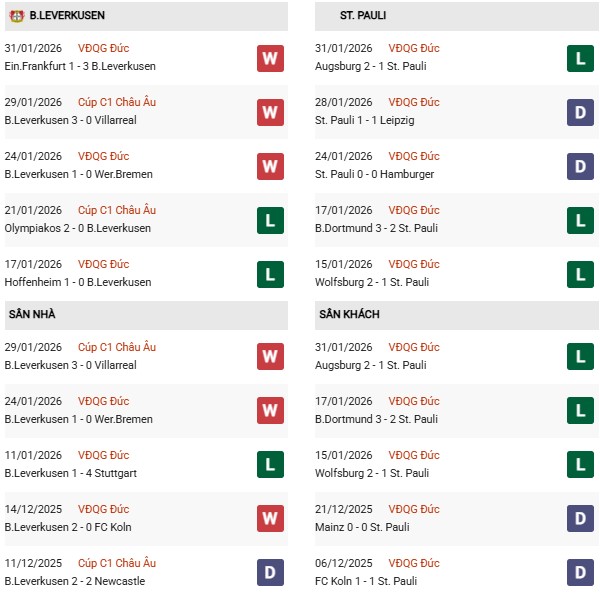Thống kê đối đầu Leverkusen vs St Pauli: