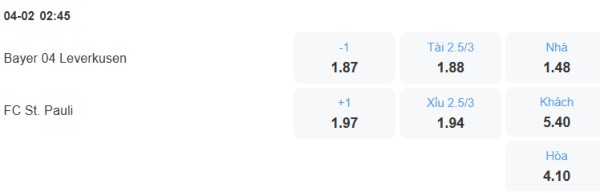 Leverkusen là đội có chất lượng đội hình tốt hơn so với St Pauli, họ cũng đang là đội có phong độ tốt hơn nên sẽ không có gì ngạc nhiên nếu phần thắng trận này thuộc về đội bóng chủ nhà. Với tỉ lệ kèo Leverkusen chấp 1 trái thì nên đặt cửa cho thầy trò HLV Kasper Hjulmand.