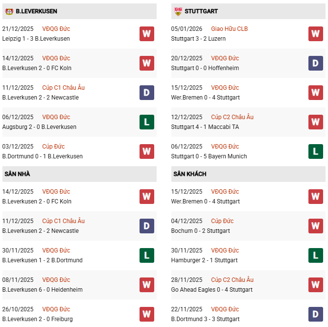 Thống kê phong độ Leverkusen vs Stuttgart: