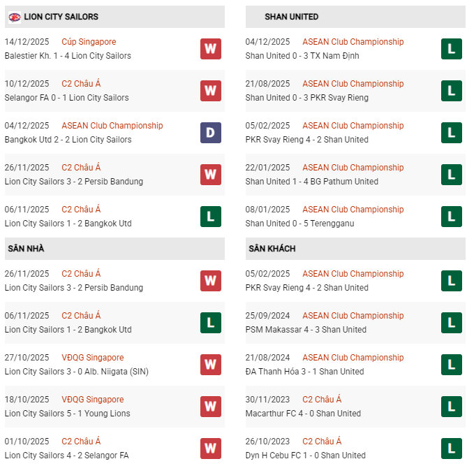 - Lion City toàn thắng cả 2 trận đối đầu gần nhất trước Shan United.