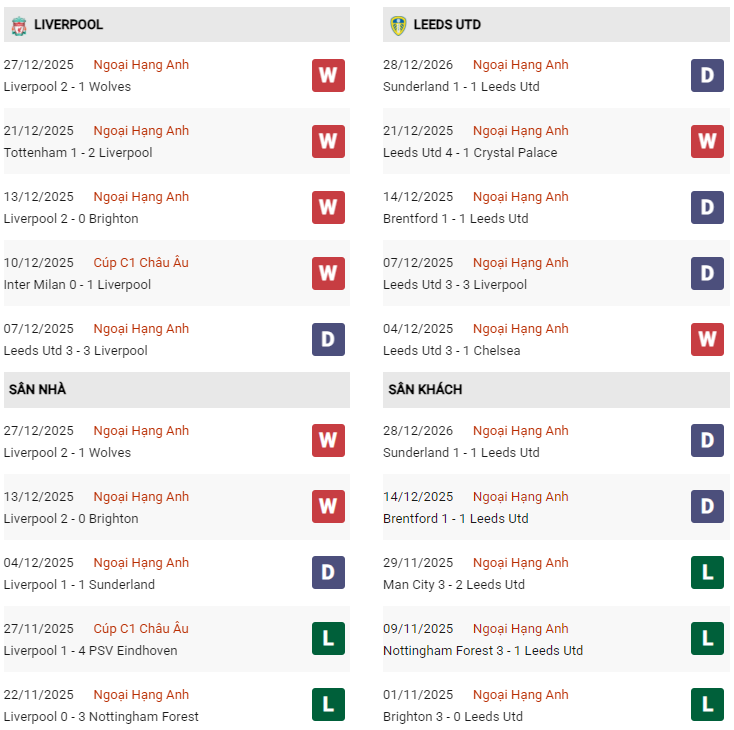 Liverpool đã giành chiến thắng ở 4 trận liên tiếp gần đây. Không những sáng cửa cạnh tranh 1 vị trí trong top 8 tại vòng bảng cúp C1 châu Âu mà The Kop còn đang đứng thứ 4 trên BXH Premier League với 32 điểm và tạo được cách biệt 3 điểm với 2 đội xếp sau là Chelsea và MU. Được chơi trên sân nhà để tiếp đón tân binh Leeds sẽ là thời cơ tuyệt vời để Liverpool nghĩ về việc giành chiến thắng ở trận đấu đầu tiên của năm mới 2026.