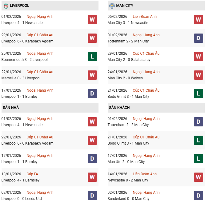 Liverpool: Đang hồi sinh mạnh mẽ dưới thời Arne Slot với chiến thắng 4-1 trước Newcastle gần đây. "Lữ đoàn đỏ" có điểm tựa Anfield cực kỳ vững chắc khi chỉ thua 1 trong 22 lần gần nhất tiếp đón Man City tại đây. Sự góp mặt của những tân binh như Florian Wirtz và Hugo Ekitike đang mang lại luồng gió mới cho hàng công.