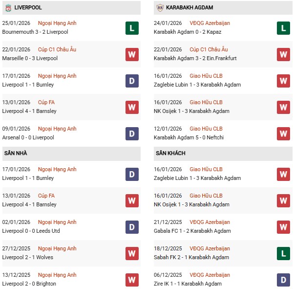 Thống kê phong độ Liverpool vs Qarabag: