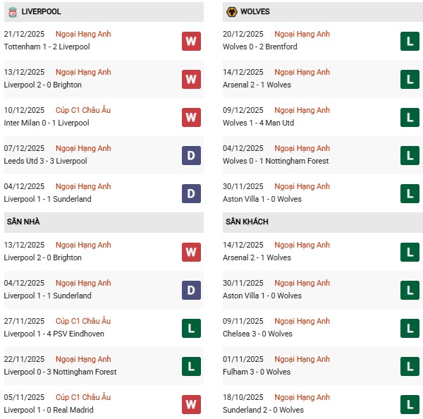 Cuộc đối đầu giữa Liverpool và Wolves chứng kiến sự chênh lệch rõ rệt về phong độ. "Lữ đoàn đỏ" đang hồi sinh mạnh mẽ với chuỗi 6 trận bất bại, đặc biệt là hai chiến thắng quan trọng trước Brighton và Tottenham giúp thầy trò Arne Slot củng cố vị trí dẫn đầu.