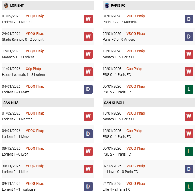 - 9 trận đối đầu vừa qua, Lorient thắng 5 thua 2 và hòa 2 trước Paris FC.