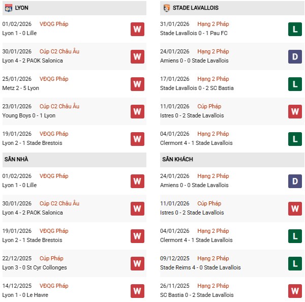 Thống kê phong độ Lyon vs Laval: