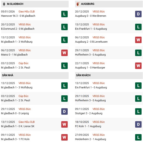 - 10 trận đối đầu gần nhất giữa 2 đội, M'gladbac thắng 2, thua 6 trước Augsburg.