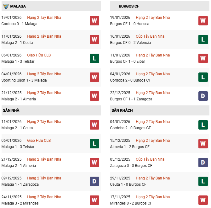Ngoài ra, Malaga đang có động lực rất lớn trong cuộc đua giành vé thăng hạng. Một chiến thắng trước đối thủ cạnh tranh trực tiếp như Burgos sẽ giúp họ bứt phá trên bảng xếp hạng. Với bối cảnh đó, Malaga hoàn toàn đủ khả năng giành chiến thắng tối thiểu.