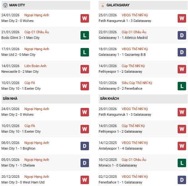 - Trong 5 trận gần nhất, Galatasaray thắng 2, hòa 2 và thua 1 trước Man City.