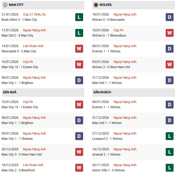 Thống kê phong độ Man City vs Wolves: