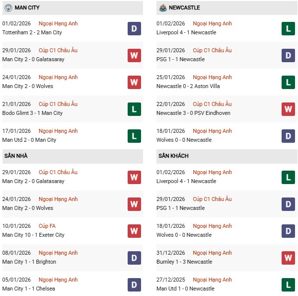Thống kê phong độ Manchester City vs Newcastle: