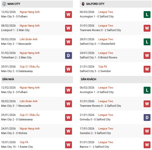 Điểm yếu lớn nhất của thầy trò HLV Karl Robinson chính là phong độ sân khách. Khi phải rời xa tổ ấm, Salford City thường tỏ ra yếu bóng vía, họ chỉ giành được 1 chiến thắng duy nhất trong 6 chuyến hành quân gần đây tại đấu trường FA Cup. Phải đối mặt với áp lực khổng lồ từ bốn phía khán đài Etihad, cơ hội để đội khách tạo nên bất ngờ là gần như bằng không.