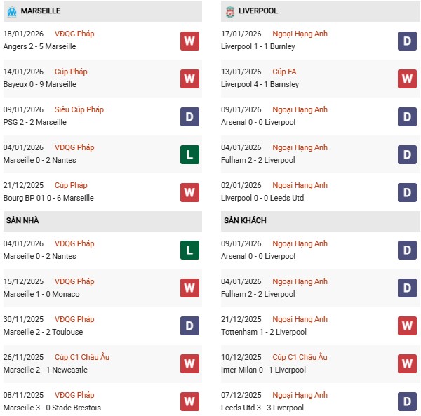 Thống kê phong độ Marseille vs Liverpool: