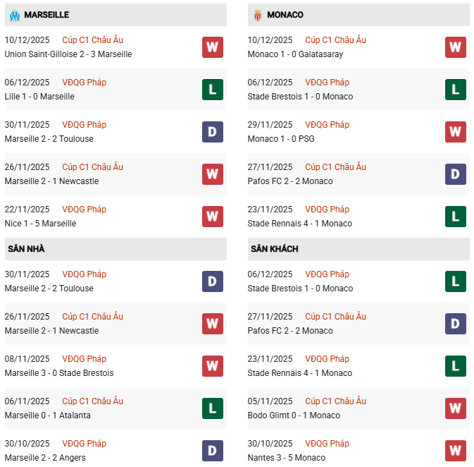 Thống kê phong độ Marseille vs Monaco: