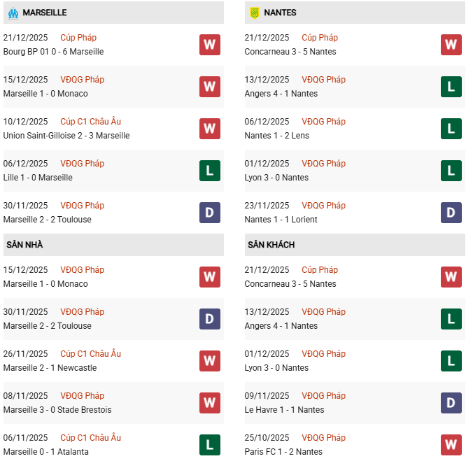 Thống kê phong độ Marseille vs Nantes: