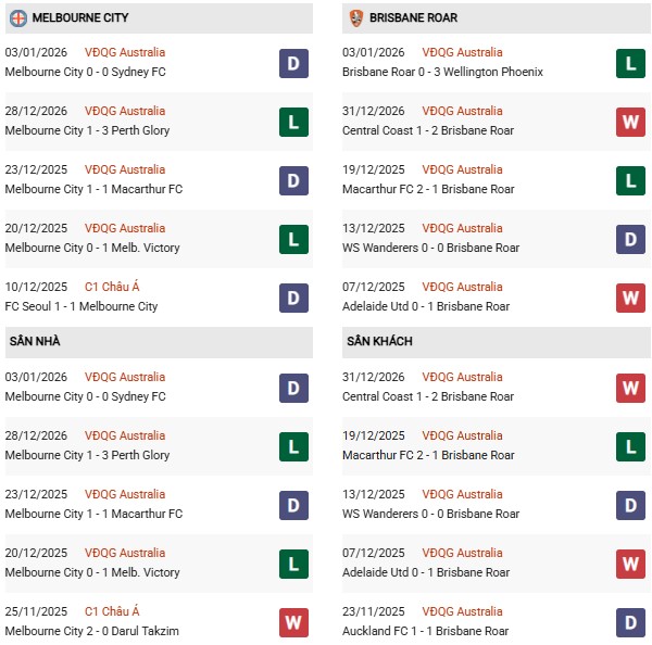 Thống kê phong độ Melbourne City vs Brisbane Roar:
