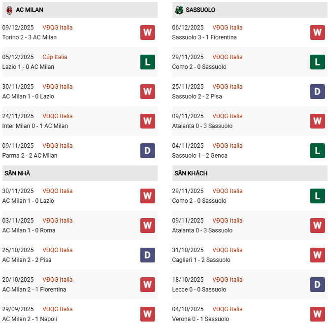 - 10 trận đối đầu gần nhất giữa 2 đội, Milan thắng 5, thua 3 trước Sassuolo.