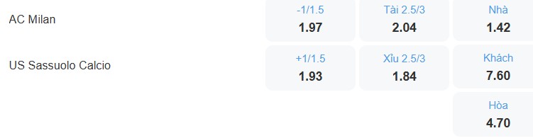 Kèo tổng số bàn thắng trận này là 2 3/4, con số không cao. Trong khi đó hàng công của cả Milan và Sassuolo đều chơi tốt thời gian gần đây khi liên tục ghi bàn trong khi hàng thủ hay để thủng lưới, các trận của 2 đội đều có khá nhiều bàn thắng được ghi. Chọn kèo Tài chung cuộc.