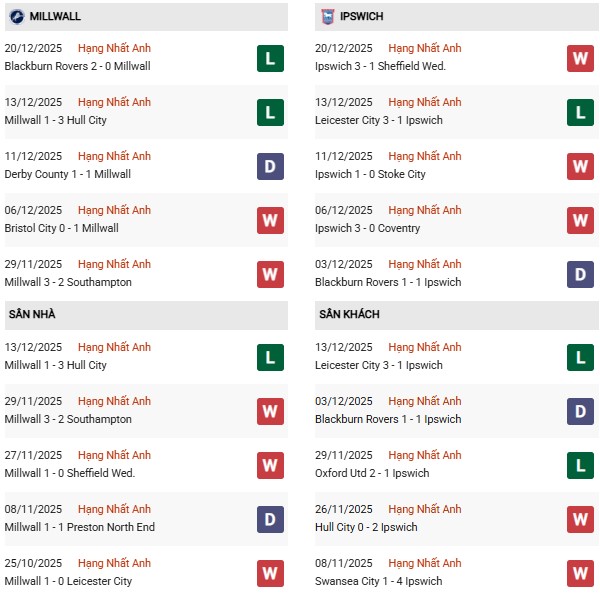 - 10 trận đối đầu gần nhất giữa 2 đội, Millwall thắng 3, thua 5 trước Ipswich.