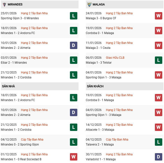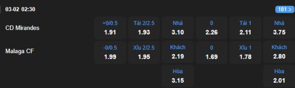 Malaga đang chiếm ưu thế rõ rệt khi giành được 3 chiến thắng, hòa 1 và chỉ để thua 1 trận. Ở trận lượt đi hồi tháng 11/2025, Malaga cũng đã đánh bại Mirandes với tỷ số 3-2. Với mức kèo chấp -0.25, đặt niềm tin vào đội khách đang có phong độ cực cao là lựa chọn sáng suốt.