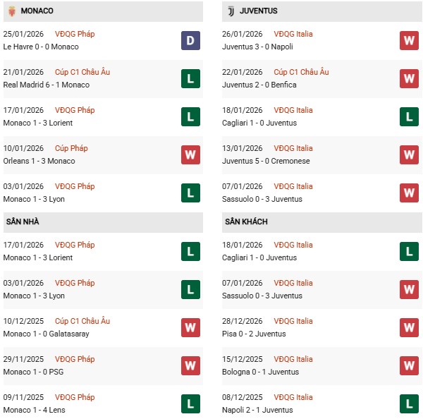 - 4 trận đối đầu gần nhất, Juventus thắng 3 và hòa 1 trước Monaco.