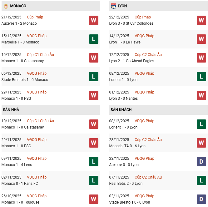 Thống kê phong độ Monaco vs Lyon: