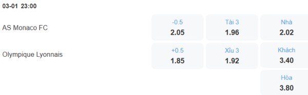 Monaco vẫn là đội có chất lượng đội hình được đánh giá nhỉnh hơn so với Lyon, việc họ thắng đối thủ cả 2 trận mùa trước cho thấy điều đó. Cộng với việc được đá sân nhà mùa này thì khả năng phần thắng trận đấu sẽ lại thuộc về Monaco. Nên với tỉ lệ kèo Monaco chấp 1/2 trái thì người chơi nên đặt cửa cho chủ nhà.
