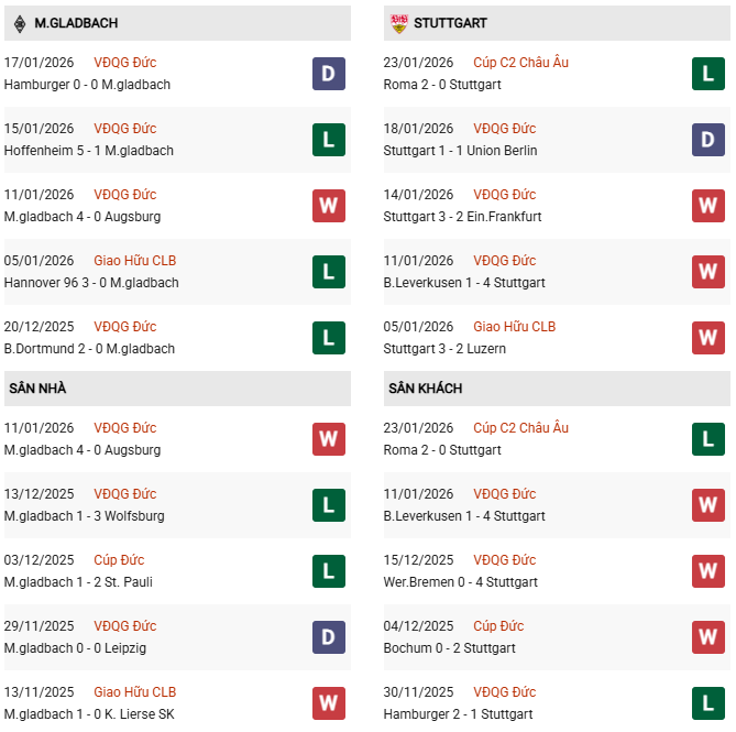 Thống kê phong độ Monchengladbach vs Stuttgart: