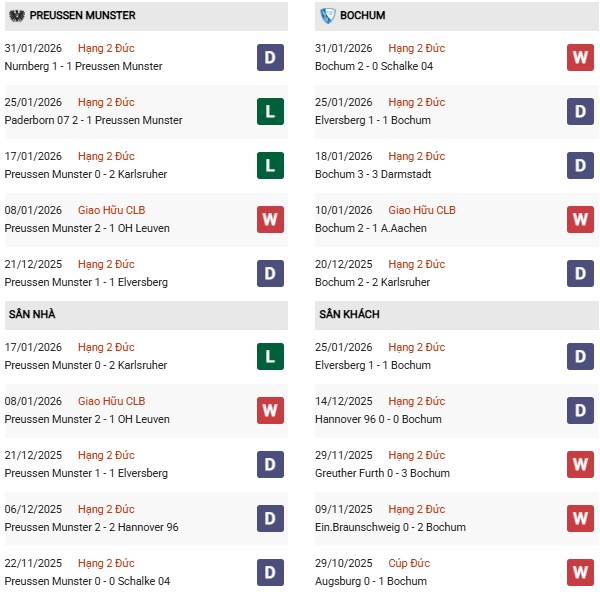 Preussen Münster đối đầu Bochum trong khuôn khổ Giải Hạng 2 Đức là trận đấu mang ý nghĩa rất khác nhau với hai đội ở thời điểm hiện tại. Münster đang nằm trong nhóm cuối bảng và phải chắt chiu từng điểm số cho mục tiêu trụ hạng, trong khi Bochum dù chưa thực sự bứt phá nhưng vẫn giữ vị trí an toàn ở nửa trên BXH. Với tương quan hiện tại, Bochum rõ ràng là đội có nền tảng ổn định hơn, song lợi thế sân nhà của Münster khiến trận đấu này không hề dễ dàng cho đội khách.