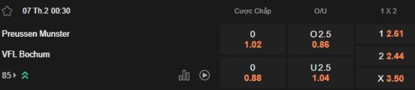 Tỷ lệ châu Á được niêm yết ở mức đồng banh (0) cho thấy đánh giá Bochum nhỉnh hơn nhẹ dù phải làm khách. Đây là mức kèo hợp lý nếu nhìn vào tương quan thực lực. Münster có lợi thế sân nhà nhưng thường gặp khó khi phải đối đầu các đội chơi kỷ luật và có khả năng kiểm soát nhịp độ tốt như Bochum. Bên cạnh đó, Bochum không phải mẫu đội áp đảo hoàn toàn, nhưng họ có khả năng tận dụng sai lầm đối phương khá tốt.
