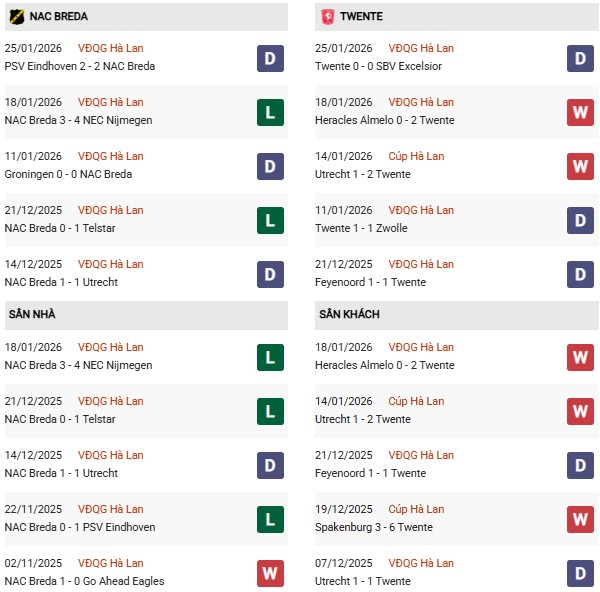 - 10 trận đối đầu vừa qua, Twente thắng 4 thua 1 và hòa 5 trước NAC Breda.